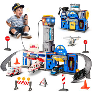 • Large City Action Track Set: Transformable playset into a police & ambulance with elevator, tracks, garage, lookout tower, helipad, 2 rescue trucks, 2 police trucks, 1 helicopter, and traffic signs. Features realistic lights, sounds, and a walkie-talkie for endless fun