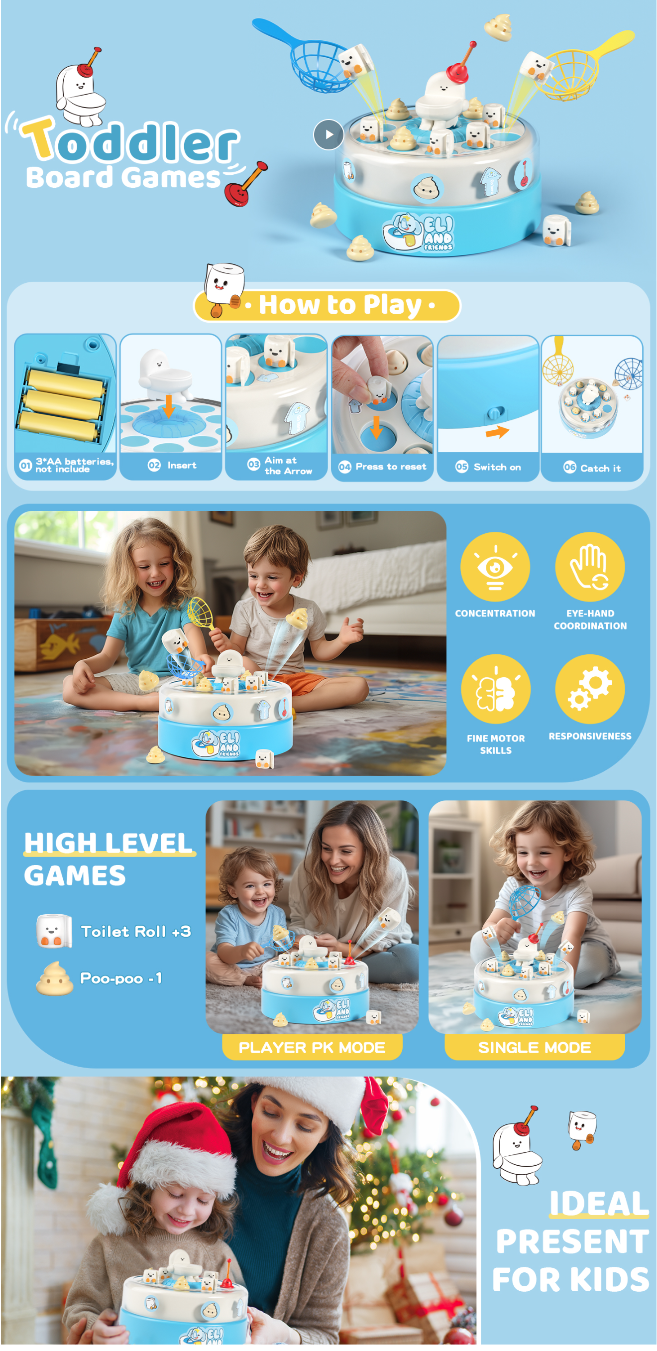 - Our games is made of safe materials with smooth edges, safe for kids to play. Parents can make a high level rule, catch a toilet roll to earn three points, but catch a poo-poo and lose one point. The player with the most points wins