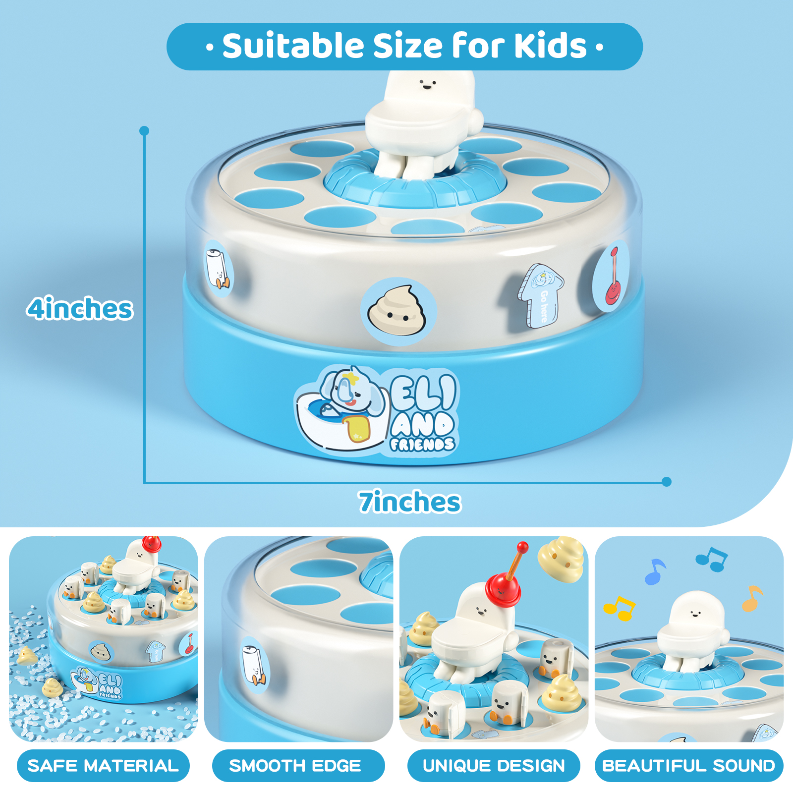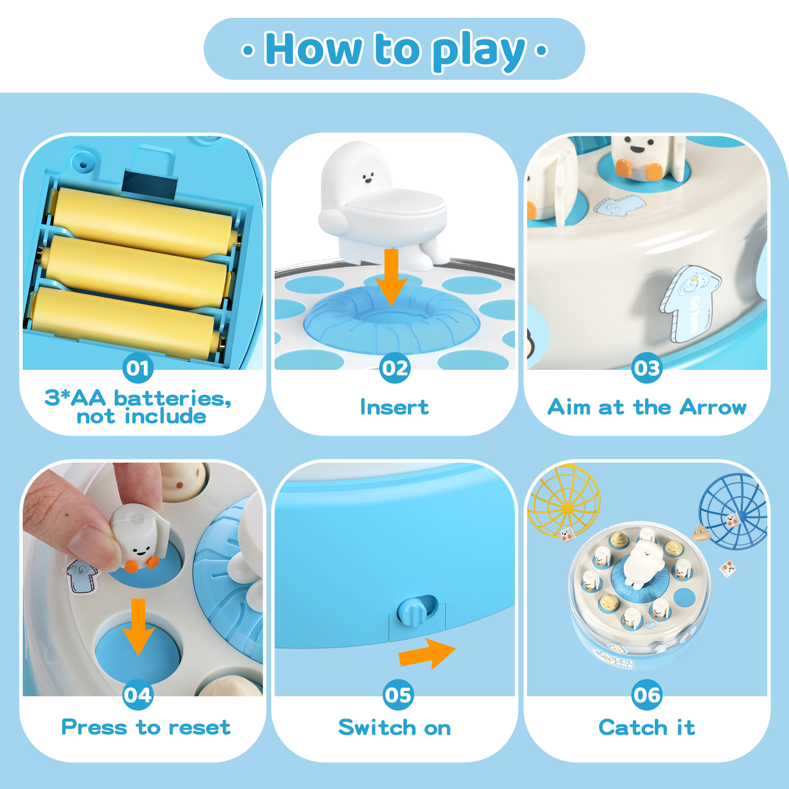 - Install the batteries and place the toilet and toys on the board.Turn on the switch, and these toys will spin with the music and bounce out randomly. Using the net to catch these toys and see who catches the most wins