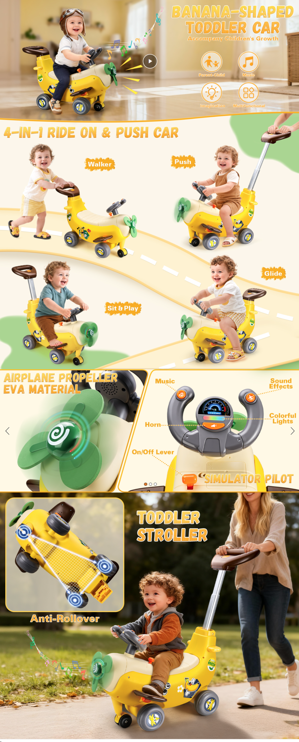 - Cute Dual-Shaped Style + Grow-With-Me Handle: Blends playful banana charm with cool airplane looks—ideal for indoor/outdoor play. Adjustable handle (15.4″/28.3″) fits kids of different heights, staying comfortable as they grow.