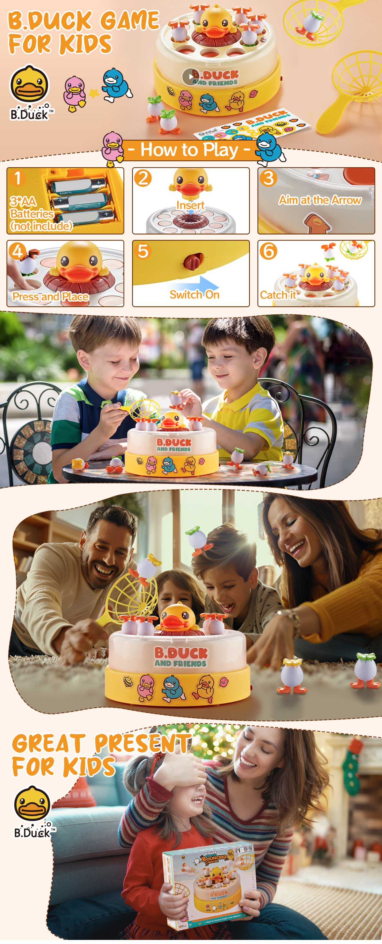 - The B.Duck game includes 1xrotating game board, 1xB.Duck toy, 2xnets, 10xegg toys and a B.Duck themed sticker. Requires 3 AA batteries (not included). Two kids can play together, providing hours of fun. Kids will like it