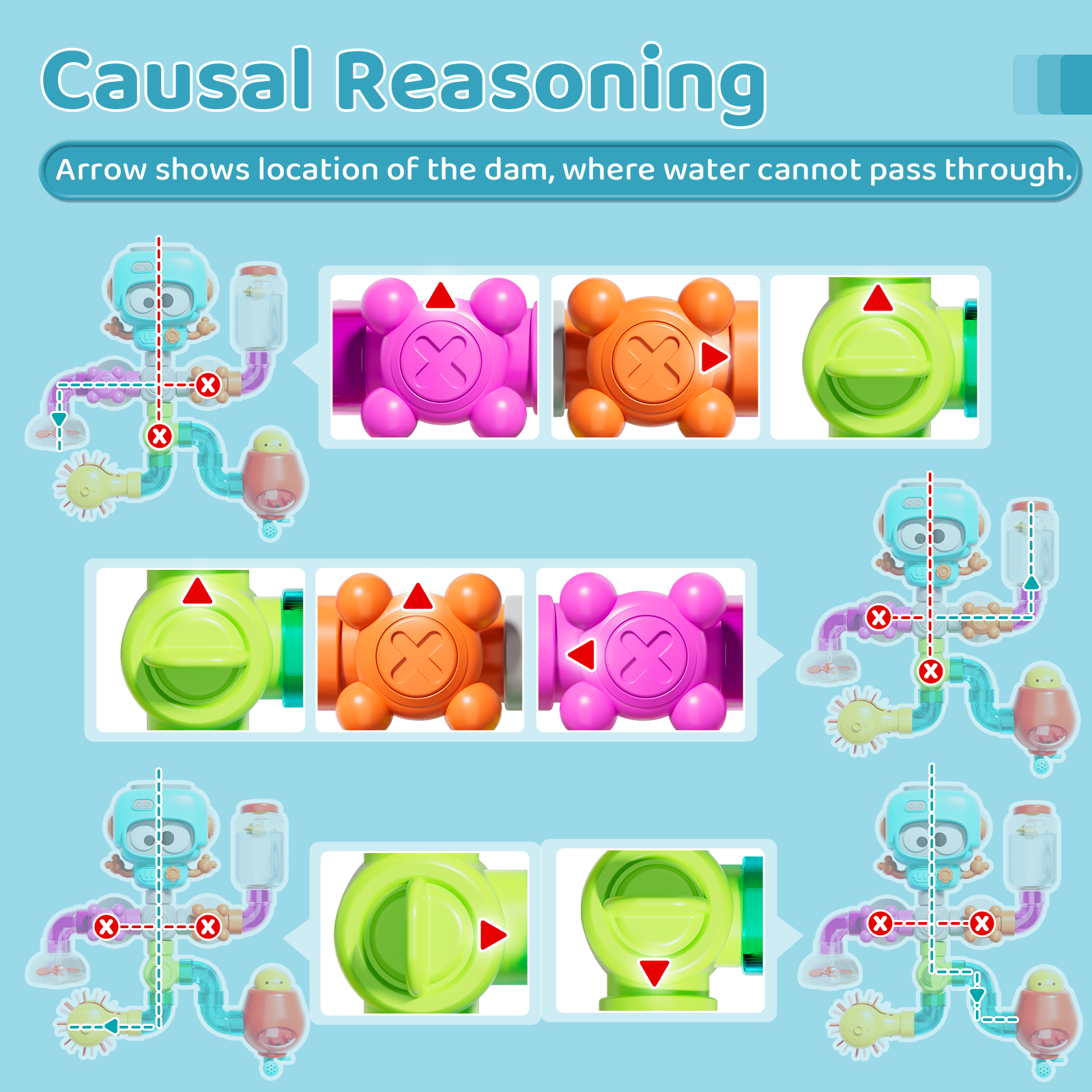 - Develop Reasoning Skills: Water valves with “blocked” arrows challenge kids to figure out water flow directions. It’s a great way to enhance reasoning and practical abilities