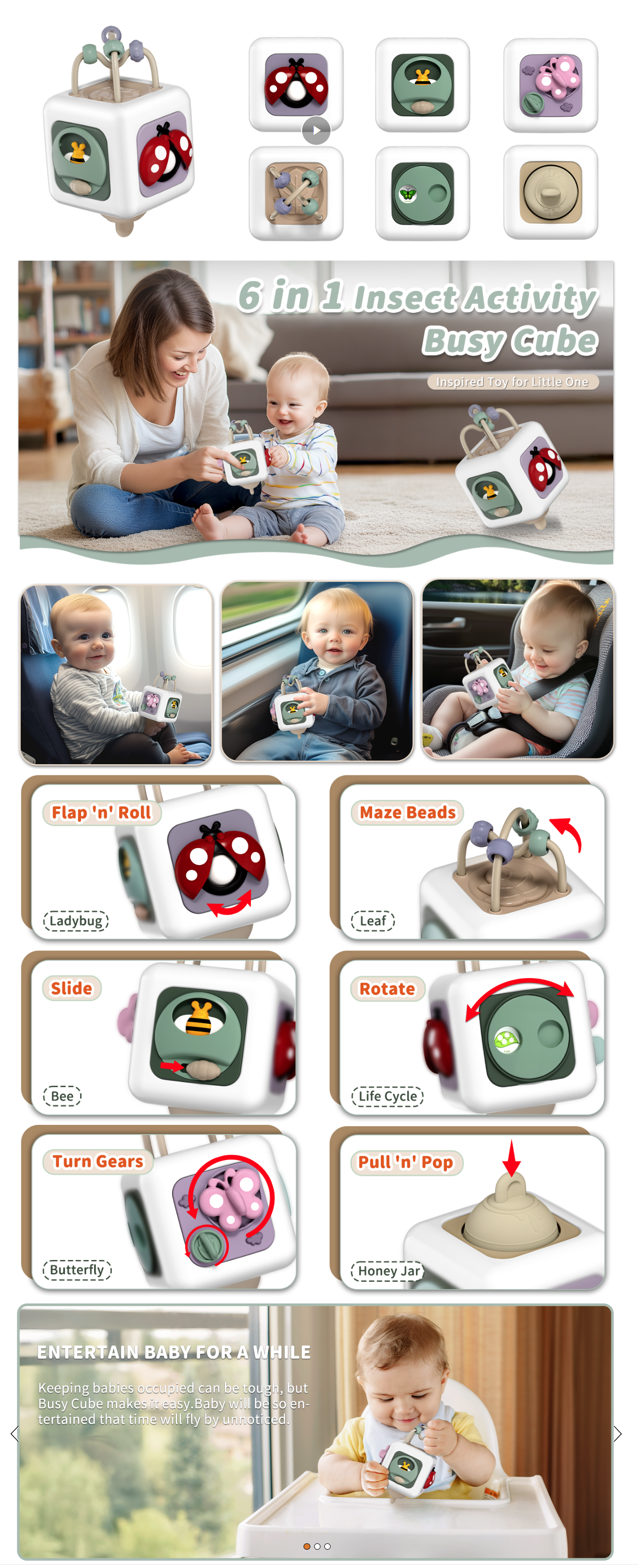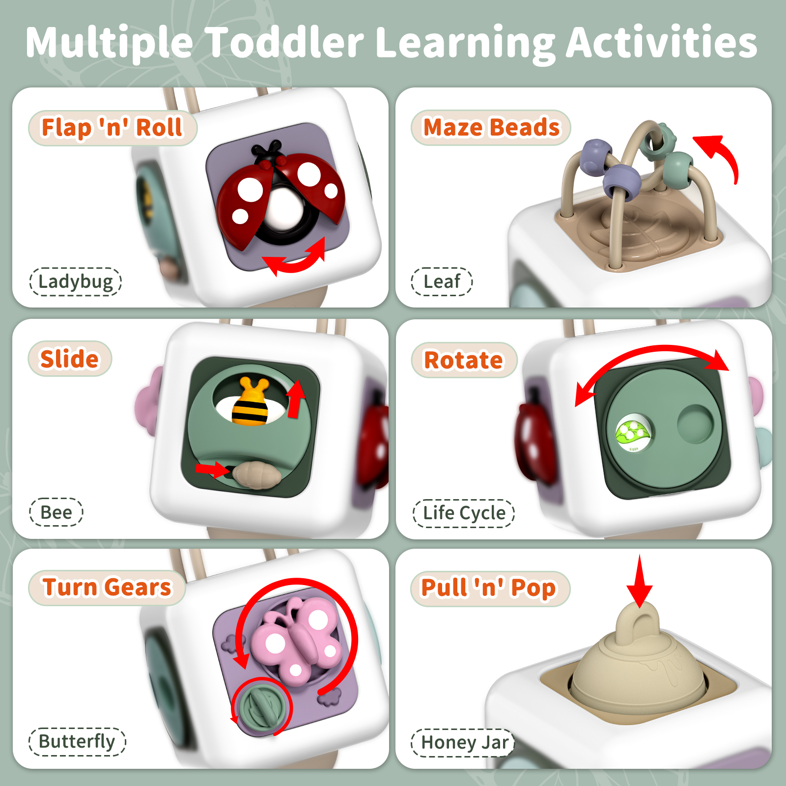 - 6-in-1 Busy Toy: This activity cube is perfect for keep little ones busy. With a secret ball, peek-a-boo, turn gears, maze beads, life cycle and push & pull