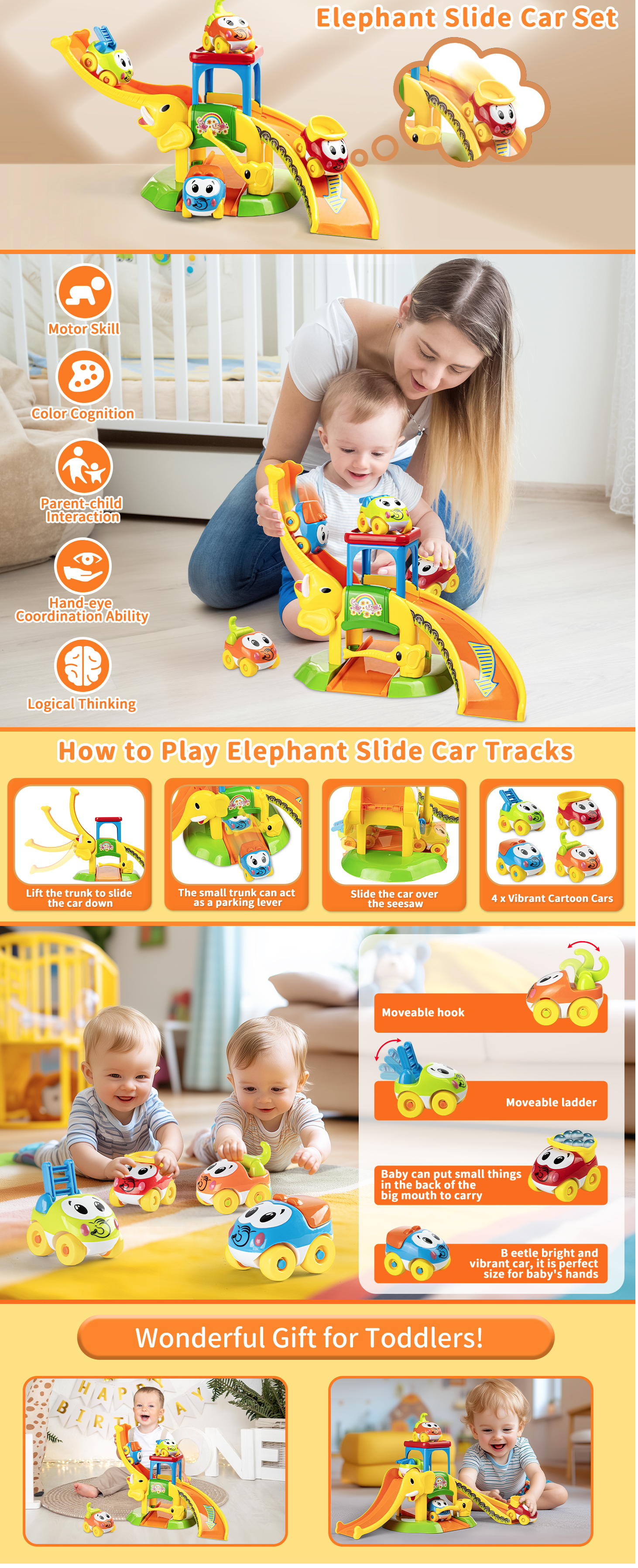 • Interactive Play: This elephant playground features exciting manipulative and interactive game play with slide parking lot and 4 cute cartoon cars , providing engaging play opportunities for young kids.